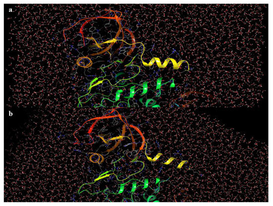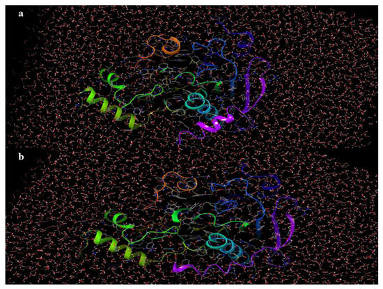 For the conclusion of the MD studies, the protein structures of GSK-3β and BuChE were analyzed for their structural stability. As depicted in Figure 12a,b, a quint alteration in the crystal structure of GSK-3β was noticed in the C-terminal arena, and in the Cα-helix no alternations in the active site topology of the macromolecule were spotted in the amid timeline of 0 to 100 ns. Similarly, for the macromolecule BuChE, a conformational change was visible in the envelope region above the active pocket of the protein, with no fluctuations in the binding site of BuChE from 0 to 100 ns of the MD scrutiny, as shown in Figure 13a,b. Overall, it was clear that both the protein X-ray crystal structures portrayed minimal shifts in their conformational solidity through the due course of the MD analysis.