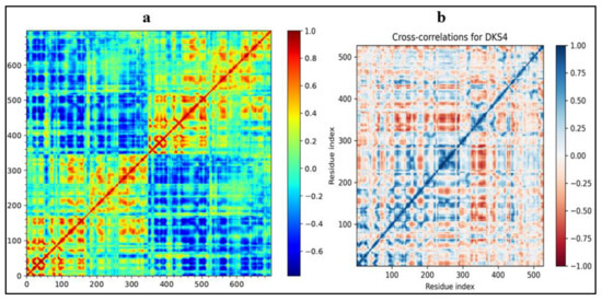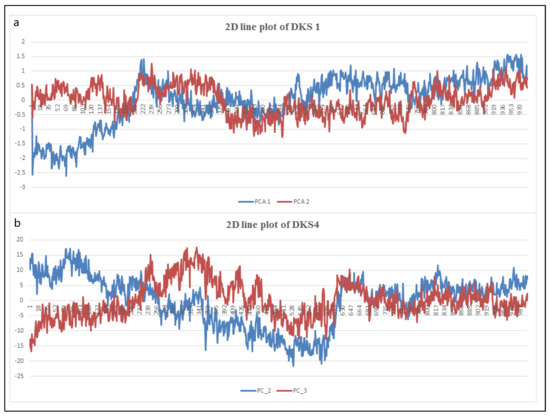 The “principal component” of the PCA provides the protein–ligand simulation dynamics. From the principal component, one can identify the structural and dynamical properties of the protein–ligand complex. It gives an idea about the binding pocket, ligand induced conformation change, and more. Figure 14a,b depict the heat maps of the compound DKS1 and DKS4, respectively. Figure 15a,b represent the 2D line graphs of DKS1 and DSK4 from these graphs, showing the stability of the protein–ligand complex. From the PCA analysis, we obtained a set of data, which are reduced to this graph by taking two values across X and Y, respectively. Interpreting the two graphs, we can see that the values attain stability at the end of the analysis. This observation gives us a valuable insight into the conformation of the protein–ligand, in that there is not much change in the conformation.