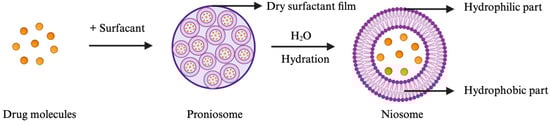 Formation of niosomes upon hydration of proniosomes with water (illustration created with BioRender.com).