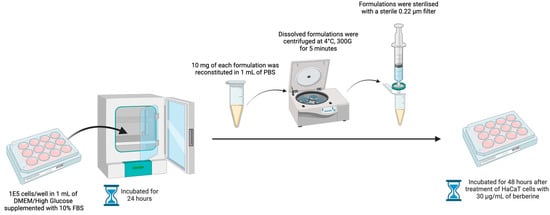 HaCaT keratinocyte cells were grown in Dulbecco’s Modified Eagle Medium (DMEM)/High Glucose supplemented with 10% Fetal Bovine Serum (FBS) in a T75 flask at 37 °C, under a humidified atmosphere of 5% carbon dioxide. The medium was changed on alternative days. Upon achieving confluency, HaCaT cells were harvested via trypsinization and seeded into a 12-well plate at a density of 1 × 105 cells per well in 1 mL of medium. The 12-well plate was incubated for 24 h. After 24 h, 10 mg of each berberine proniosome gel formulation was reconstituted in 1 mL of PBS. The dissolved formulations were centrifuged at 4 °C, 300 G, for 5 min and sterilized with a 0.22 µm filter. HaCaT cells were treated with 30 µg/mL of berberine, and then incubated for 48 h [19]. To monitor the antioxidant stress activity and cell viability of HaCaT cells, the protocol from the ab65329 total antioxidant capacity assay kit (colorimetric) was performed accordingly [32].