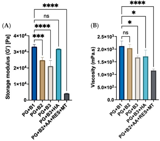 (A) Graph of storage modulus (Pa) of different berberine proniosome formulations with a shear strain of 0.03% (n = 3). (B) Viscosity (mPa.s) of different berberine proniosome formulations with a shear rate of 50 1/s (n = 3). PG+B1, PG+B2, and PG+B3: 0.5%, 1%, and 1.75% of berberine; PG+B2+AA+RES+MT: 1% of berberine, 1% of ascorbic acid, 1% of resveratrol, and 2% of menthol w/w for proniosome gel. PG+B3+HA: 1.75% of berberine and 1.75% of hyaluronic acid w/w for proniosome gel. One way ANOVA; p > 0.05 (ns: not significant), p ≤ 0.05 (*), p ≤ 0.001 (***) and p ≤ 0.0001 (****).