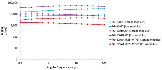 Frequency sweep analysis: storage and loss modulus (Pa) of PG+B3, PG+B3+HA, and PG+B2+AA+RES+MT (1% and 1.75% of berberine) proniosome formulations against angular frequency (rad/s; n = 3). PG+B2+AA+RES+MT: 1% of berberine, 1% of ascorbic acid, 1% of resveratrol, and 2% of menthol w/w for proniosome gel. PG+B3+HA: 1.75% of berberine and 1.75% of hyaluronic acid w/w for proniosome gel.