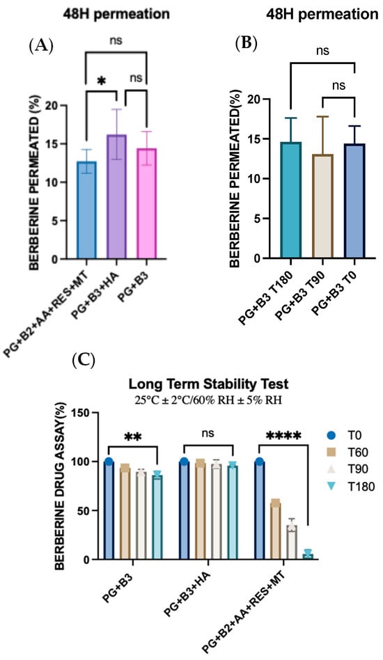 (A) One-way ANOVA test for berberine permeated (%) after 48 h between PG+B2+AA+RES+MT, PG+B3+HA, and PG+B3 (n = 3). (B) One-way ANOVA test for berberine permeated (%) after 48 h between stability of PG+B3 (time zero, after 3 months at room temperature, and after 6 months at room temperature; n = 3). (C) Long-term stability tests of berberine formulations at 25 °C and 60% RH over six months (T0: time zero, T60: 2 months, T90: 3 months, and T180: 6 months; n = 3). PG+B2+AA+RES+MT: 1% of berberine, 1% of ascorbic acid, 1% of resveratrol, and 2% of menthol w/w for proniosome gel. PG+B3+HA: 1.75% of berberine and 1.75% of hyaluronic acid w/w for proniosome gel. PG+B3: 1.75% of berberine w/w for proniosome gel. One-way ANOVA; p > 0.05 (ns: not significant), p ≤ 0.05 (*), p ≤ 0.01 (**), and p ≤ 0.0001 (****).