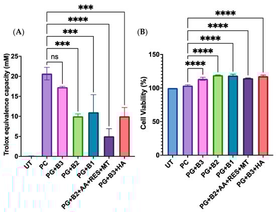 (A) Trolox equivalent capacity (mM) (3 technical replicates), whereby untreated control, positive control (Trolox), and proniosome gel formulations were compared to the standard, Trolox, according to the ab65329 total antioxidant capacity assay kit (colorimetric) protocol [32]. (B) Cell viability (%) of HaCaT cells after 72 h of incubation (n = 3). One-way ANOVA; p > 0.05 (ns: not significant), p ≤ 0.001 (***), and p ≤ 0.0001 (****). PG+B2+AA+RES+MT: 1% of berberine, 1% of ascorbic acid, 1% of resveratrol, and 2% of menthol w/w for proniosome gel. PG+B3+HA: 1.75% of berberine and 1.75% of hyaluronic acid w/w for proniosome gel. PG+B3: 1.75% of berberine w/w for proniosome gel. PG+B2: 1% of berberine w/w for proniosome gel. PG+B1: 0.5% of berberine w/w for proniosome gel.