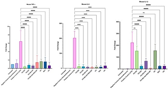 Plotted graphs of fold change against the respective mouse pro-inflammatory cytokine: TNF-α, IL-6, and IL-1β for positive control (LPS), negative control (dexamethasone), untreated cells, proniosome gel formulations—PG+B2+AA+RES+MT: 1% of berberine, 1% of ascorbic acid, 1% of resveratrol, and 2% of menthol w/w for proniosome gel; PG+B3+HA: 1.75% of berberine and 1.75% of hyaluronic acid w/w for proniosome gel; PG+B3: 1.75% of berberine w/w for proniosome gel; PG+B2: 1% of berberine w/w for proniosome gel; PG+B1: 0.5% of berberine w/w for proniosome gel—and excipients: AA, RES, and HA, respectively (n = 3). One-way ANOVA; p > 0.05 (ns: not significant, p ≤ 0.001 (***), and p ≤ 0.0001 (****).