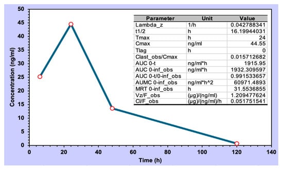 Berberine, upon topical administration of the formulation of PG+B3 in mice, exhibited a biological half-life of 16 h (Figure 9). This is consistent with a slow permeation through the skin and the fact that the accumulation in the subdermal layer may adapt as a reservoir for controlled release, given that the half-life of berberine in plasma for intravenous injection in rats is short (0.22 h) [63].