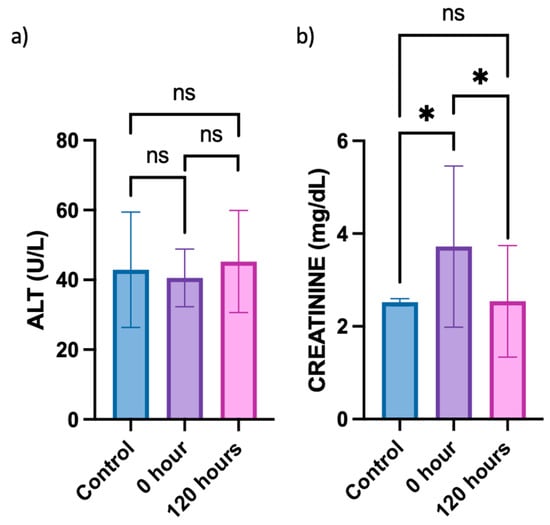 To investigate whether the berberine proniosome gel exerts any toxic effects on the liver and affects kidney function, alanine aminotransferase (ALT) and creatinine levels in plasma acquired from the in vivo animal study were determined, respectively. Since the ALT levels in the control (healthy mice) typically ranged from 25 to 60 U/L, all groups of mice involved in the in vivo study exhibited normal plasma ALT levels (Figure 11) [63,64]. This suggests that the topical administration of berberine proniosome gel did not lead to any liver toxicity. Based on the comparison of creatinine levels between the control (healthy mice) and 0 h, whereby CHIKV infection was induced without topical administration of berberine proniosome gel, an initial increase in the creatinine levels was observed (Figure 11). However, after the topical administration of 1.75% berberine proniosome gel for 120 h, creatinine levels returned to baseline values, ranging from approximately 0.06 to 2.5 mg/dL. This observation indicates that the berberine proniosome gel exhibited reversible effects on creatinine levels, with statistically significant differences (p ≤ 0.05) observed between the control group and the 0 h time point, as well as between the control group and the 120-h time point.