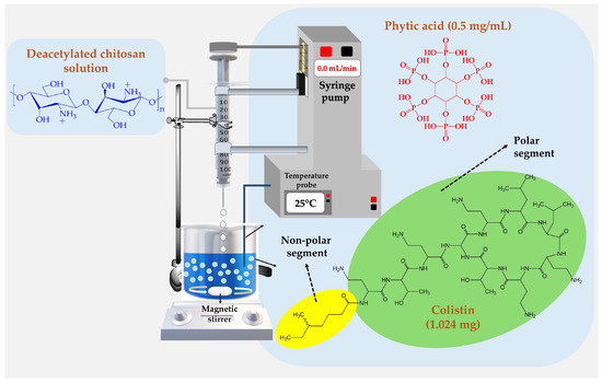 A schematic representation of the development of chitosan nanoparticles cross-linked with phytic acid and loaded with colistin is illustrated in Figure 1.