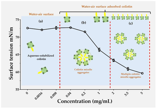 Characterization of surface tension of colistin in aqueous medium at different concentrations. (a) <0.008 mg/mL, (b) between 0.04 mg/mL and 5 mg/mL, (c) above 5 mg/mL.