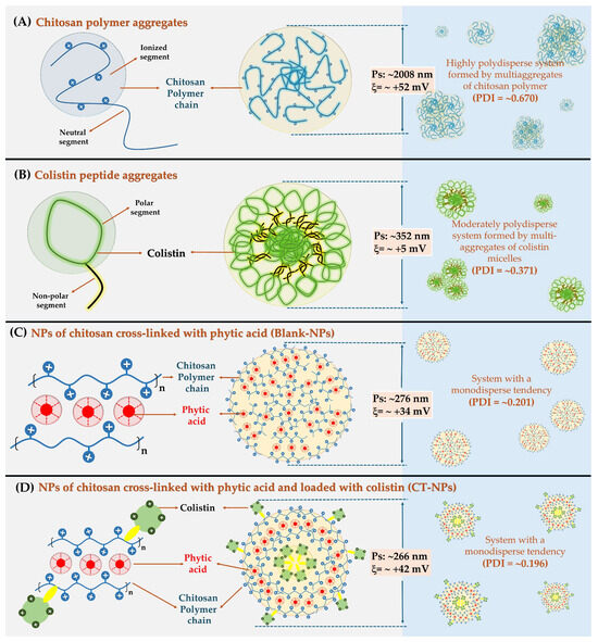 The results shown in Table 1 indicate that chitosan dispersed in an aqueous medium formed heterodisperse colloidal systems generated from the aggregation of multiple polymer chains and therefore, establishing high particle size (2008 ± 155 nm) and polydispersity (PDI = 0.670 ± 0.275) values. Such an aggregation phenomenon is mediated from the multiple inter-polymeric association of those polymeric neutral segments, while those ionized segments generate by the protonation of their amino groups provide it with a polycationic character (: +52.4 ± 1.04 mV) (Figure 3A). In the case of colistin dispersed in water, a similar behavior was observed, where a polydisperse colloidal system with particle size of 351.8 ± 41.1 nm and a PDI of 0.371 ± 0.008 was achieved. These aggregation systems are probably formed by the multiple aggregation of micellar systems (Figure 3B). As previously described in Section 3.3.1, colistin can form micellar-type aggregation systems, which in turn can aggregate with each other due to its neutral surfactant characteristics evidenced by a low zeta potential value (+5.02 ± 0.65 mV). Nevertheless, these results are very interesting because they allow for demonstrating that the ionic gelation process entails the formation of nanostructured systems, which are mediated by the intrinsic characteristics of each material employed. In this way, the formation of blank-NPs is mediated by the cross-linking effect of phytic acid that forces the chitosan chains to organize in a highly structured manner (Figure 3C). In contrast, the formation of CT-NPs is mediated by the formation of micelles that lead to the cross-linked chitosan chains interacting with them, constructing a completely different type of particle (Figure 3D). All these results are very interesting since they demonstrate that the ionic gelation process leads to the formation of structured systems, which are mediated by the intrinsic characteristics of the compounds that make up the nanoparticle.