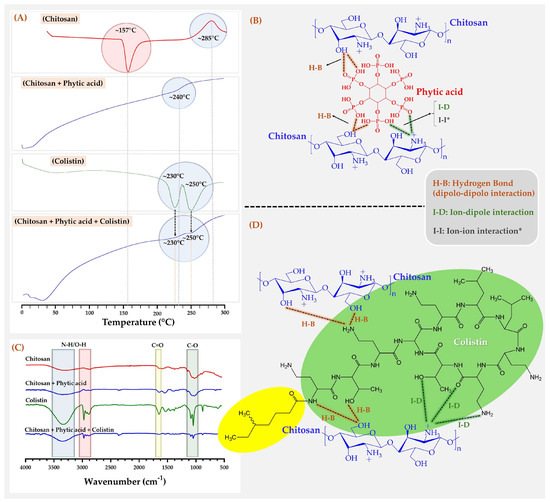 (A) DSC thermograms of NPs components, (B) schematic representation of colistin–phytic acid cross-linking chitosan, (C) FTIR spectra of NPs components, (D) schematic representation of colistin with a chitosan segment. * I-I interaction assumes that the phosphate group is ionized.