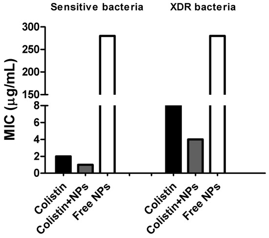 Regarding antimicrobial activity, the MIC of colistin was halved after being encapsulated within the NPs, in sensitive and XDR bacteria, suggesting a relevant antimicrobial contribution of chitosan NPs to colistin. Furthermore, the free colistin NP exhibited antimicrobial activity against P. aeruginosa, regardless of whether it was or was not resistant to colistin.