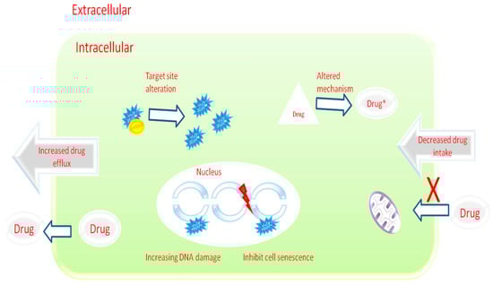 Schematic illustration of mechanisms contributing to the development of MDR in cancer cells. Cancer cells have developed a wide range of mechanisms to fight against various therapeutical drugs. Abc transporters, alterations in the apoptosis pathway, drug inactivation through cellular metabolism, and mutations in cellular and drug targets, an enhanced DNA repair mechanism, are well-known mechanisms. Altered mechanism in the cancer cell nullifies the effect of drug by changes in various properties which denoted as drug*.
