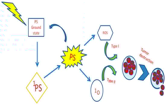 Photofrin was the first approved PDT-based drug molecule for bladder cancer therapy in 1993 [53]. Currently, many commercial PSs are available on the market to treat cancer. Photodynamic therapy relies on three main components: a PS, light, and molecular oxygen. The PS is in an inactive state when it enters the cell. It can be activated with an appropriate light source. Oxygen is the crucial component required for the therapy to be effective. Once activated, the PS can interact with the surrounding oxygen and undergo two types of reactions, as represented in Figure 2. The PS absorbs the light, excites it to a higher state in its electron configuration, and produces free radicals that are toxic to the cell. These radicals interact with targeted molecules and affect their function, which eventually leads to cell death. In contrast, singlet oxygen occurs when triplet-state molecules interact with oxygen present inside the cell. They are toxic and highly reactive. The formation of singlet oxygen relies on the process of triplet–triplet annihilation. Both types of ROS reactions take place at the same time. To achieve effective treatment, it is crucial to maintain a harmonious equilibrium between the concentration of the PS, oxygen molecules, and the affinity of the PS with the substrate. ROSROS and singlet oxygen are highly reactive and have a shorter half-life. Therefore, when localizing the PS within the intended system, these factors should be considered [54].