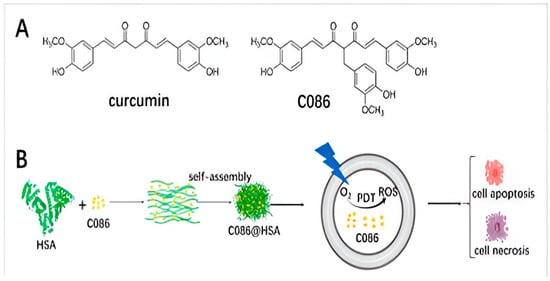 (A) Schematic illustrations of the chemical structure of curcumin and its derivative C086 and the preparation of C086@Hsa nanoparticles and the process of photodynamic therapy. C086, a derivative of curcumin, was loaded into the albumin-based nanoparticles by a simple self-assembly method. (B) The formation of self assembled curcumin derivative loaded Human serum albumin for PDT against cancer cells “Reprinted with permission from Ref. [147]. 2021, Elsevier B.V.”.
