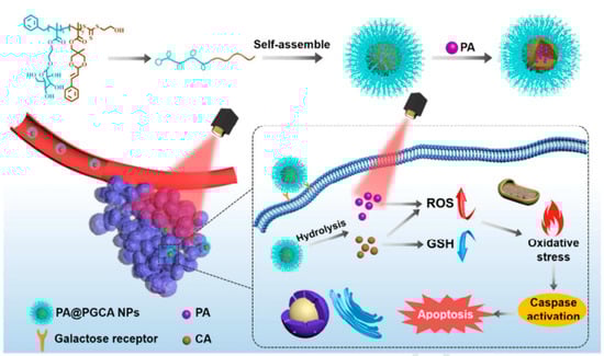 A schematic illustration of the synthesis process of PGCA@PA nanoparticles and the mechanism by which they induce cell death using light exposure. The acid-responsive polygalactose-co-polycinnamaldehyde polyprodrug was combined with cinnamaldehyde (CA) and PS pheophorbide A (PA). The galactose receptor present in cancer cells is responsible for the internal breakdown of PGCA NP and the generation of ROS levels upon exposure to light. This ultimately leads to the apoptosis of cancer cells. “Reprinted with permission from Ref. [120]. 2020. Elsevier B.V.”.