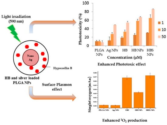 Schematic illustrations of HB and silver nanoparticles loaded with PLGA nanoparticles that were prepared for this study. The focus was on investigating the phototoxicity and singlet oxygen production of HB under light irradiation. To achieve this, polylactide-co-glycolide nanoparticle formulations were developed by incorporating HB and nanosilver enhances the toxicity against cancer cells. Reprinted with permission from Ref. [178]. 2017. Elsevier B.V.