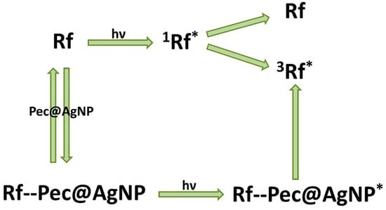 Schematic illustration of effect of Pec@Ag on the generation of the triplet excited state of Rf (3Rf*) by the presence of pectin-coated silver nanoparticles (Pec@AgNP) due to the formation of a complex between Rf and Pec@AgNP (Rf-Pec@AgNP). Pec@AgNP* represents the formation of superoxide radicals when irradiated with light. These radical are toxic against cancer cells. Reprinted with permission from Ref. [92] 2018. American Chemical Society.