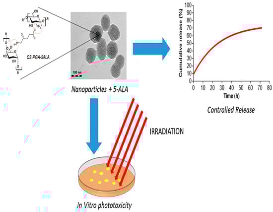 Schematic illustration of the preparation of CS-PGA-5-ALA nanoparticles and their phototoxicity under light illustration. The nanocomplexes were prepared by using chitosan as a polycation and alginic and polygalacturonic acid as polyanions through coacervation. “Reprinted with permission from Ref. [126]. 2017. Elsevier B.V.”.