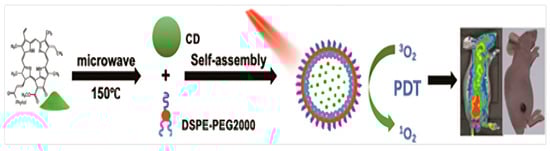 Schematic illustration of CD assembly derived from pheophytins for FL imaging and synergistic PDT of cancer. Pheophytin is a type of Mg-free chlorophyll derivative used for the preparation of CDs by using a microwave method and self-assembled with DSPE-mPEG2000 for efficient 1O2 generation and efficient fluorescence (FL) imaging. Reprinted with permission from Ref. [99]. 2019. Wiley.