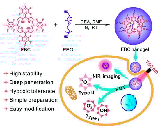 Schematic illustration of the synthesis of FBC nanogel and the mechanism of the PDT performance of the FBC nanogel. A bacteriochlorin analogue, tetra fluorophenyl bacteriochlorin, was developed by the one-step reduction of tetra fluorophenyl porphyrin (TFPP). A biocompatible FBC nanogel could be directly formed by blending FBC with SH–PEG–SH. “Adapted with permission from Ref. [127]”.
