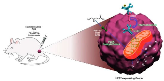 Traditional light sources have severe limitations, such as a lack of penetration depth inside the tumor region. Such a problem can be overcome by a technique called self-exciting PDT, which uses radioactive energy to excite PSs [235,236]. Hu and colleagues developed a comprehensive PDT nanosystem (LHHP) by encasing both luminol and hemoglobin within a hierarchically porous metal–organic framework (MOF) for effective light-induced regeneration therapy and self-sufficiency in oxygenation. This assembly featured tetrakis(4-carboxyphenyl)porphyrin (TCPP) as the organic linker, which was evenly distributed within the hierarchically porous porphyrinic MOF (HP-PCN-224) to avoid clustering, and the porous nature of HP-PCN-224 facilitated the binding of hemoglobin to it, thus aiding in the delivery of oxygen [237]. Luminol would react with the overproduced hydrogen peroxide in the tumor area, resulting in the emission of blue chemiluminescence. TCPP captured light energy through a CRET process to produce luminescence, and this light energy was subsequently transferred to the oxygen attached to hemoglobin to form reactive oxygen species (ROS). Following the injection of the LHHP nanocomposite, it was observed to significantly inhibit the growth of tumors beneath the skin in the subcutaneous 4T1 tumor model. This research marked a significant milestone in the field of PDT to treat cancers located deep within the body, using a singular PDT nanosystem that could provide both self-luminescence and self-sufficiency in oxygen supply [238]. Jo and her team developed a sophisticated and successful photo-activated therapy technique using Cerenkov light in PDT, which is based on the unique properties of 5-aminolevulinic acid (5-ALA) and 64Cu-DOTA-trastuzumab (Figure 12) [239]. This combination allows for the precise delivery of charged particles to the cancerous area by targeting the 64Cu-DOTA-trastuzumab, while the buildup of PpIX at the site facilitates the absorption of Cerenkov light emitted by 64Cu within the tumor, leading to the production of cytotoxic oxygen molecules, 1O2. The researchers created a tumor model under the skin of NCI-N87 cancer cells in nude mice that express high levels of HER2. They showed that the use of this two-targeted approach for the tumor, namely 5-ALA and 64Cu-DOTA-trastuzumab, effectively reduced the tumor’s size with no noticeable adverse reactions.