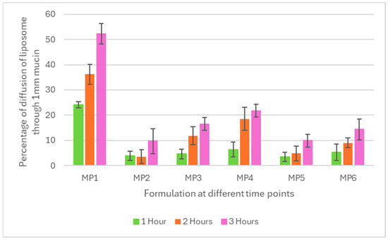 The liposomal formulation (MP1) achieved 24% in the first hour and 36% in the second hour, but the maximum penetration achieved was 52% after three hours. The experiment was conducted for three hours because the normal residence time in the stomach is approximately three hours. The liposomal formulation (MP4) exhibited a maximum of 25% after three hours. However, in the first and second hour, they were 6% and 18%, respectively.