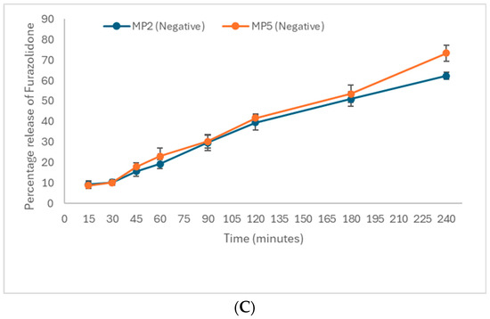 The results of the in vitro drug release for both drugs (furazolidone and NAC) were consistent with a study that stated that negatively charged liposomes released the maximum amount of drug compared to positive and neutral liposomes [71]. This fact is also mentioned in another study, which stated that imparting a negative charge to liposomes enhances the release rate of neutral particles at alkaline pH, similar to the current study conducted at pH 6.0 [70,72].