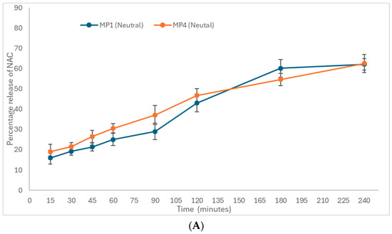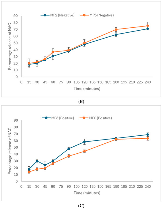 (A). In vitro drug release of NAC from the mucopenetrative formulation from MP1 and MP4 for up to 4 h time at pH 6.0 (n = 3, mean ± SD shown). Abbreviations: MP1 (neutral with Pluronic F-127), MP4 (neutral without Pluronic F-127). (B). In vitro drug release of NAC from the mucopenetrative formulation from MP2 and MP5 for up to 4 h time at pH 6.0 (n = 3, mean ± SD shown). Abbreviations: MP2 (negative with Pluronic F-127), MP5 (negative without Pluronic F-127). (C). In vitro drug release of NAC from the mucopenetrative formulation from MP3 and MP6 for up to 4 h time at pH 6.0 (n = 3, mean ± SD shown). Abbreviations: MP3 (positive with Pluronic F-127), MP6 (positive without Pluronic F-127).