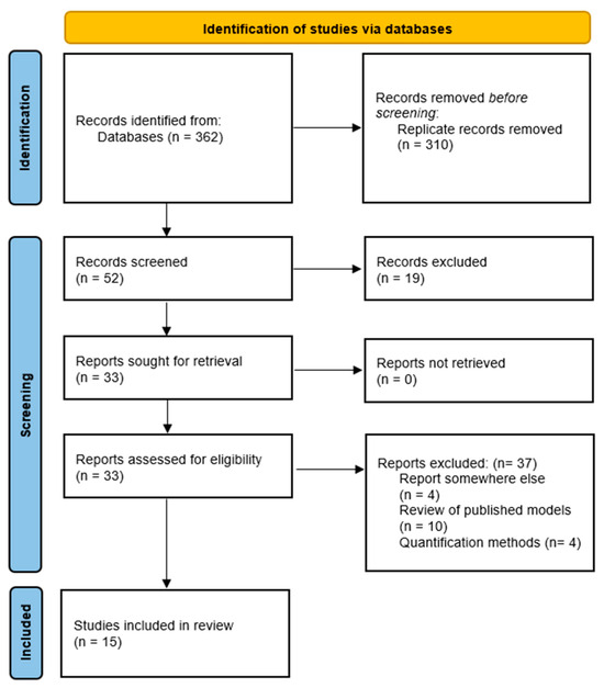 A total of 362 articles were identified in the databases, and then, titles and abstracts were screened. Three hundred ten replicates were eliminated, and of the fifty-two remaining titles and abstracts, screening and full-text screening were performed; the study selection flow chart is detailed in Figure 1.