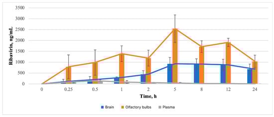 The administration of drugs via the nasal route allows for the achievement of optimal therapeutic outcomes due to the presence of extensive blood vessels in the nasal cavity, a large injection site (~160 cm2), and the rapidity of pharmacological action. Among other advantages, intranasal delivery represents a more appealing alternative for patients undergoing therapy compared to invasive routes of drug administration. Another noteworthy benefit of intranasal delivery is the capacity to transport APIs from the nasal cavity directly to the brain, a process known as nose-to-brain delivery. This delivery mechanism is possible due to the penetration of APIs through cranial nerves innervating the nasal cavity. The study by Colombo et al. was one of the first to describe studies of ribavirin absorption in the nasal cavity and its distribution in the brain. Ribavirin was administered both intranasally and intravenously to compare bioavailability. In the first in vivo experiment, an aqueous solution of ribavirin was administered intranasally to Sprague–Dawley rats (10 mg/kg). The study was conducted in different hemispheres and brain regions (cerebellum, olfactory bulb, cerebral cortex, basal ganglia, and hippocampus) and biological fluids (cerebrospinal fluid and plasma). Ribavirin was quantified using mass spectrometry. By instrumental analysis, API was detected in all compartments at each time point, with the highest concentration in the olfactory bulb and a decrease in the rostro–caudal direction. Two subsequent in vivo experiments compared the nasal route of administration (ribavirin solution) with intravenous and nasal administration of ribavirin solution with ribavirin powder for intranasal administration (10 mg/kg) [24]. It was found that 20 min after administration, the concentration of ribavirin in the olfactory bulb was similar after intravenous or nasal administration of ribavirin solution, whereas the powder resulted in significantly higher levels. Although the intravenous route of administration is the most effective, the basal ganglia and hippocampus were shown to be clearly superior to the intranasal administration of API when analyzing the basal ganglia and hippocampus [24].