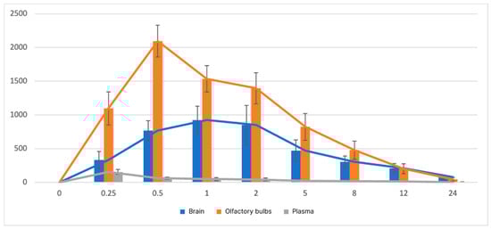 Upon thawing, the olfactory bulbs and brains were weighed and then homogenized using a FASTPREP-24 homogenizer (Mp Biomedicals Germany GmbH, Eschwege, Germany) in a 0.9% NaCl solution. The used ratio (w/w) was 1:1 for brains and 1:20 for olfactory bulbs. This homogenization process was repeated three times for 20 s each at a speed of 4.0 m/s. Subsequently, the homogenate was centrifuged under the following conditions: 20 min at 15,000 rpm (g = 27,671) for the brain homogenate and 15 min at 1500 rpm (g = 277) for the olfactory bulb homogenate. The resulting supernatant was then transferred to Eppendorf tubes and stored at −20 °C until ready for pharmacokinetic analysis.