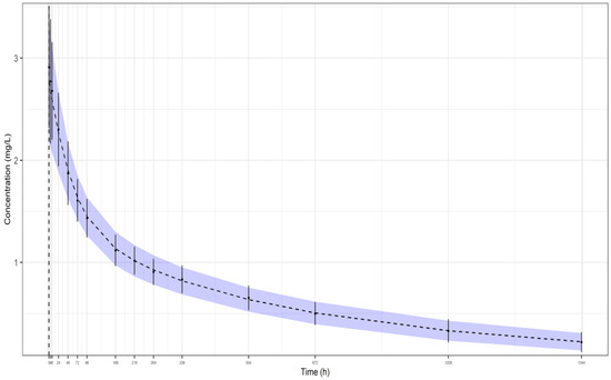 The plot, which was, firstly, generated to give a better insight into the aim of our proposed methodology, is presented in Figure 1. The black dashed line, shown in the plot, represents the model’s predicted mean plasma concentrations of 1000 random patients, while the upper and lower bounds of the blue area reflect the model’s predicted SDs of the plasma concentrations, in particular, the (mean + SD) and (mean − SD), respectively. Also, the black dots with the error bars represent the simulated aggregate data, namely, the means and SDs, generated with the package deSolve. As shown in the plot, the model seems to be able to predict the simulated aggregate data. The respective parameter estimates are shown in the legend of Figure 1.