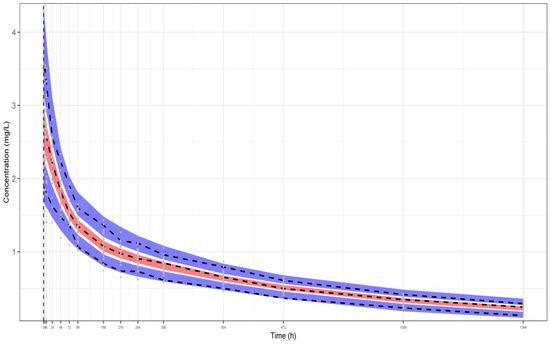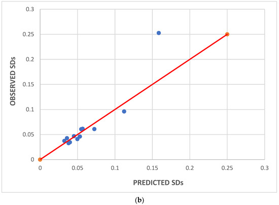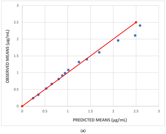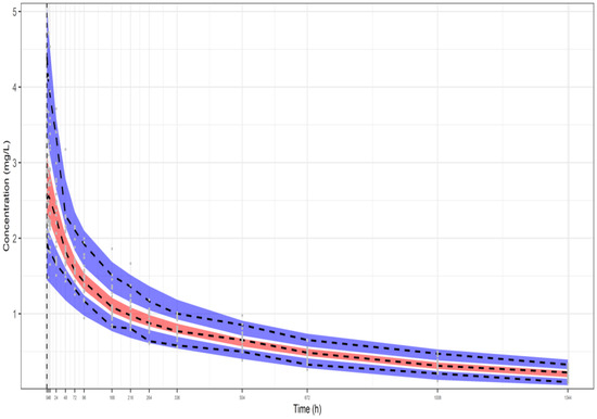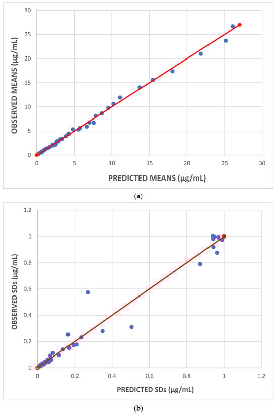 Moreover, observed versus predicted plots of the mean plasma concentrations as well as their SDs are shown in Figure 5a (means) and Figure 5b (SDs). In both Figures, the dispersion of all values is symmetrical along the red unit line. It is also noted that the exponential error was used for both the means and the SDs, since mean plasma concentrations and their SDs are always positive. Hence, the dispersion is narrower at lower values and wider at higher values along the unit lines.