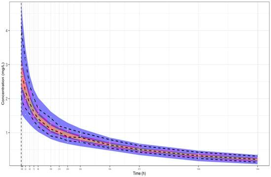 The three representative VPCs that were plotted for each dataset scenario, as described above, are presented in, Figure 2, Figure 3 and Figure 4. The black dashed lines shown in these plots represent the median, the fifth, and the 95th percentile of the plasma concentrations of the original simulated dataset, while the grey dots are all the concentrations at each time point. Also, the 90% prediction intervals (fifth, 50th, and 95th percentiles from 1000 virtual patients) together with 95% CI around each of the percentiles are shown as well. The red filled areas represent the CI of the medians, while the blue areas represent the CI of the fifth and 95th percentiles. It is noted that all the data lie within the 95% CI of the predictions. The VPCs for datasets I (Figure 2) and II (Figure 3) demonstrate that the model can predict the original simulated dataset, derived from 24 patients, although the parameters have been estimated only from the aggregation of these data, namely, the mean plasma concentrations and their respective SDs. The respective parameter estimates are shown in the legends of the three Figures. In addition, the VPC for 10 patients (dataset III—Figure 4) results to a similar plot showing good predictions, with slightly wider CIs.