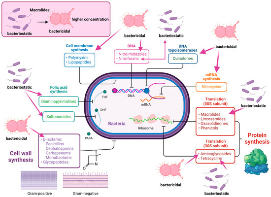 Antibiotic therapy mechanisms of action relevant to nosocomial settings (created with Biorender.com, accessed on 8 June 2024).