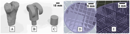 Digitalized femur (A) from human femur measurements, spacer (B) intended to be placed in the knee during PJI, and designed test construct (C) intended to contain antibacterials and spacer fill pattern of cross-linked overlapping beams (D,E) using “Rhinoceros 3D” software [36].