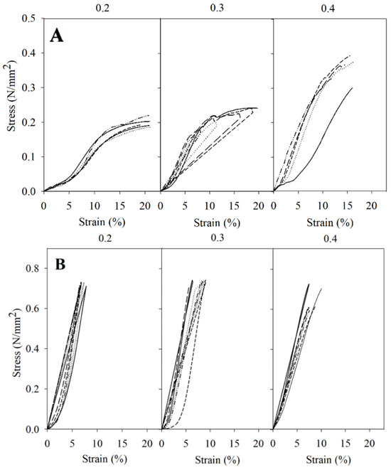 Representation of stress–strain for the 1.20 cm3 spacers in horizontal (A) and vertical (B) position for each layer thickness (n = 6) using the Zwick/Roell Z005 dynamometer.