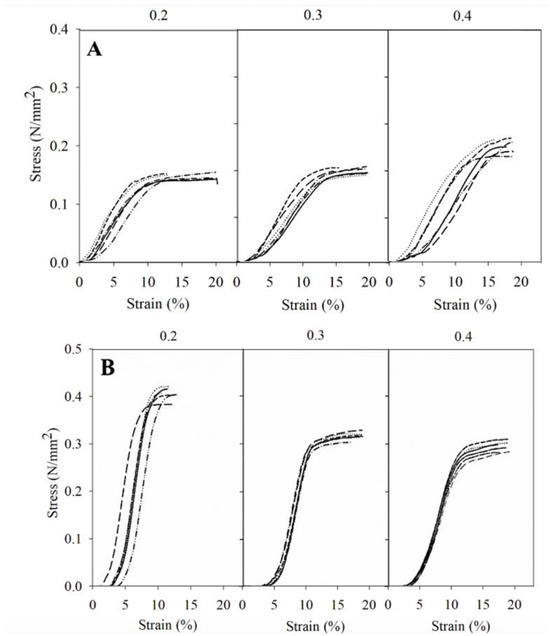 Representation of stress–strain for the 23.12 cm3 spacers in horizontal (A) and vertical (B) position for each layer thickness (n = 6) using the Zwick/Roell Z005 dynamometer.