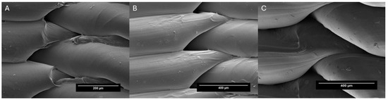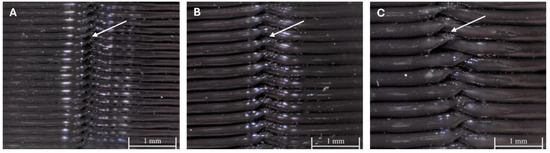 Electron microscope images of (A) 0.2 mm layer at 150× magnification and (B) 0.3 and (C) 0.4 mm layer at 300× magnification to show how each layer of filament superimposes over the next to create pores.