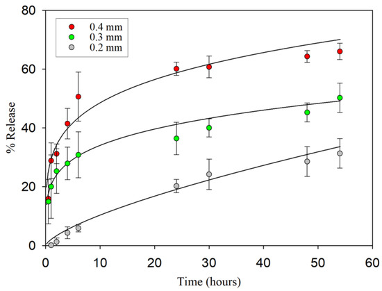 Percentage of MB released from the 1.20 cm3 3D constructs printed with a layer thickness of 0.2 mm, 0.3 mm, and 0.4 mm for up to 54 h. The regression lines are fitted using the Korsmeyer–Peppas model.