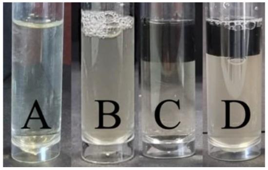 0.5 McFarland standard 1/10 dilution of Staphylococcus aureus test tubes after 24 h of incubation. (A) negative control (S. aureus and CLOX in solution); (B) positive control (S. aureus, no antibacterial); (C) 3D constructs loaded with CLOX; (D) 3D constructs without CLOX. The 3D constructs in this image have been printed with a layer thickness of 0.2 mm.