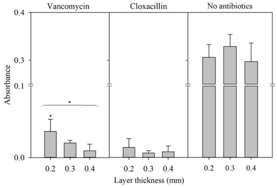 Absorbance for each 3D construct printed with different layer thicknesses (0.2, 0.3, and 0.4 mm) loaded with the antibacterials VAN and CLOX and constructs without loaded antibacterials (no antibacterials) after being incubated for 24 h to allow bacterial growth. * Indicates the statistical differences between the three layer thicknesses (p = 0.01); # indicates the differences between 0.2 and 0.4 mm (p < 0.05).