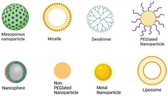 Over ten clinical drugs are available for breast cancer [25]. Some breast cancer nanomedicines in clinical trials include NK-105, SPI-077, and Xyotax® for metastatic breast cancer, and Genexol®-PM, Mitoxantrone hydrochloride liposome, and Rexin-G for recurrent or metastatic breast cancer, all administered through intravenous infusion. Doxil® was approved by the Food and Drug Administration (FDA) in 1995, Abraxane® in 2005 and 2008 by the European Medicines Agency (EMA), and Myocet® in 2000 [4]. Clinically approved anticancer drugs for breast cancer treatment include Myocet, Apealea, Marqibo, Vyxeos, and Oncaspar [33]. Very few nanomedicines are available for the clinical treatment of breast cancer. These include Nanoxel, Doxil®/Caelyx®, Lipusu®, Kadcyla®, Lipodox®, and Abraxane®, highlighting an urgent need to develop more nanomedicines that can reach clinical trials [15]. Several breast cancer nanomedicines are currently under clinical trials (Table 1). These nanomedicines are in various forms, including nanoparticles, dendrimers, micelles, non- and PEGylated liposomes, etc. (Figure 2).