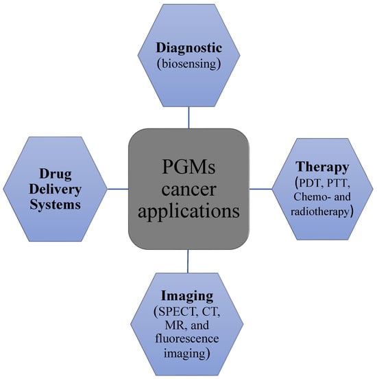 Nanoparticles in cancer therapy continue to garner interest [16]. Metallic nanoparticles show excellent prospects in targeted therapy [6] and multiple biomedical applications [17]. PGMs, like noble metals, can be tailored to meet bionanomaterial requirements for diagnosis [18], therapy [19], drug delivery [20], biosensing, and imaging [21,22]. There is potential for overcoming current therapeutic challenges and improving diagnosis, detection, and therapy through PGMs [23]. Limited research has been conducted on PGMs in breast cancer therapy.