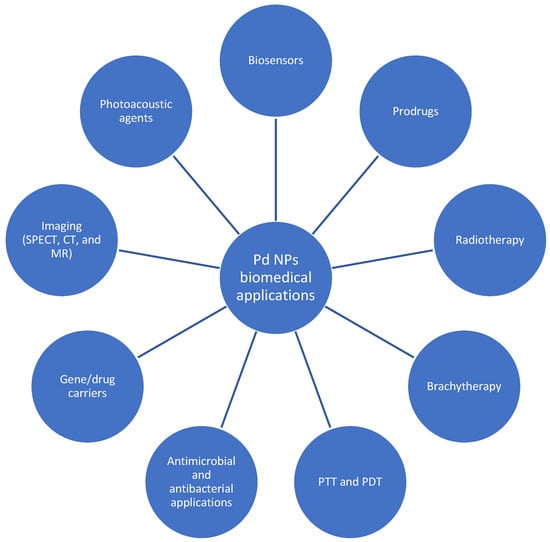 - Phan, T.T.V.; Huynh, T.C.; Manivasagan, P.; Mondal, S.; Oh, J. An Up-to-Date Review on Biomedical Applications of Palladium Nanoparticles. Nanomaterials 2020, 10, 66. [Google Scholar] [CrossRef]