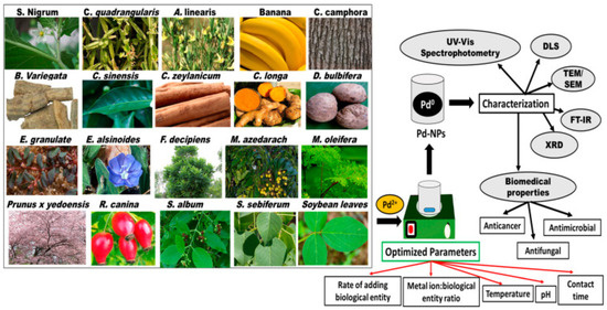 Combination of medicinal plant species with palladium nanoparticles for anticancer and related biological studies involving optimisation conditions through various characterisation techniques. Reproduced with copyright permission from MDPI [86]. [Dynamic light scattering (DLS), Fourier transform-infrared spectroscopy (FTIR), scanning electron microscopy (SEM), transmission electron microscopy (TEM), and X-ray diffraction spectroscopy (XRD)].