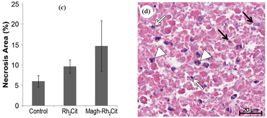 (a–d) Tumour volume, tumour area, percentage of necrosis area, and coagulation necrosis of 4T1 tumour tissue sections of the non-treated and treated groups, respectively. The a* in Figure 6b signify that Magh-Rh2Cit is statically non-significant. The arrows in (d) signify the pyknotic nuclei (white arrow), karyolysis (black arrow), karyorrhexis (arrowhead). Reproduced with copyright permission [130].