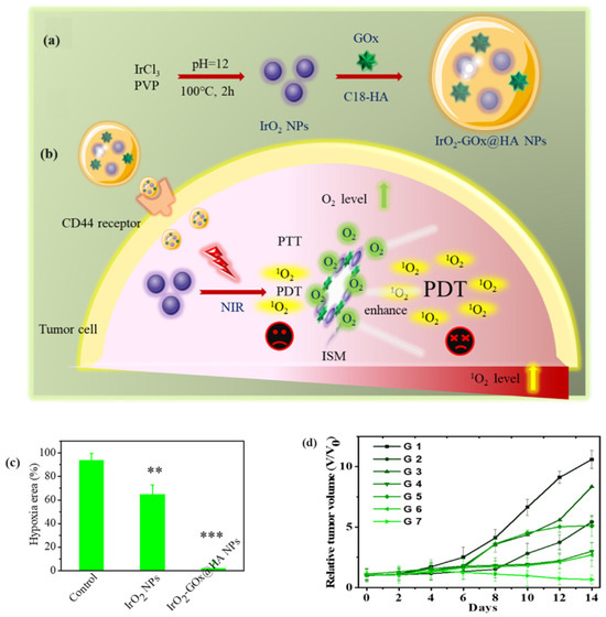 (a) The synthetic procedure for IrO2-GOx@HA NPs. (b) Mechanism of action of IrO2-GOx@HA NP after binding to the CD44 receptor located on the tumour cell surface, followed by infiltration into the cell, triggering an in situ reaction facilitated by IrO2 NPs and GOx. The arrow signifies the in-situ reaction mediated by IrO2 NPs and GOx forms an amplifier to enhance the II type PDT mediated by IrO2 NPs themselves. (c) Hypoxia areas were quantified using Image J software (https://imagej.net/ij/, accessed on 25 August 2024). Statistical significances were calculated via Student’s t-test, *** p < 0.001, ** p < 0.01, compared with the control group (d) Cancer volume changes in 14 days after various treatments. The groups are as follows: G 1 (Control), G 2 (PTT), G 3 (PDT), G 4 (PTT + PDT), G 5 (PTT + IrO2-GOx@HA NPs), G 6 (PDT + IrO2-GOx@HA NPs), and G 7 (PTT + PDT + IrO2-GOx@HA NPs). Reproduced with copyright permission from Elsevier [161]. Where GOx is glucose oxidase, PDT is photodynamic therapy, PTT is photothermal therapy, and PVP is polyvinyl pyrrolidone.