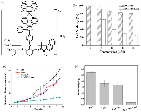 (a) The chemical structure of the iridium(III)-cyanine complex. (b) The viability of 4T1 cells was assessed by culturing them with varying concentrations of IrCy NPs (0, 5, 10, 25, and 50 μM) followed by laser irradiation. (c) Changes in tumour volume over time under different treatments. (d) Tumour weight measured on the 14th day after PDT for each of the four groups. Reproduced with copyright permission from the American Chemical Society [169].